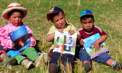 Tres niños pomabambinos, que suelen suelen jugar a los músicos en la hora de su recreo en el jardín, vienen capturando la sintonía de los visitantes...