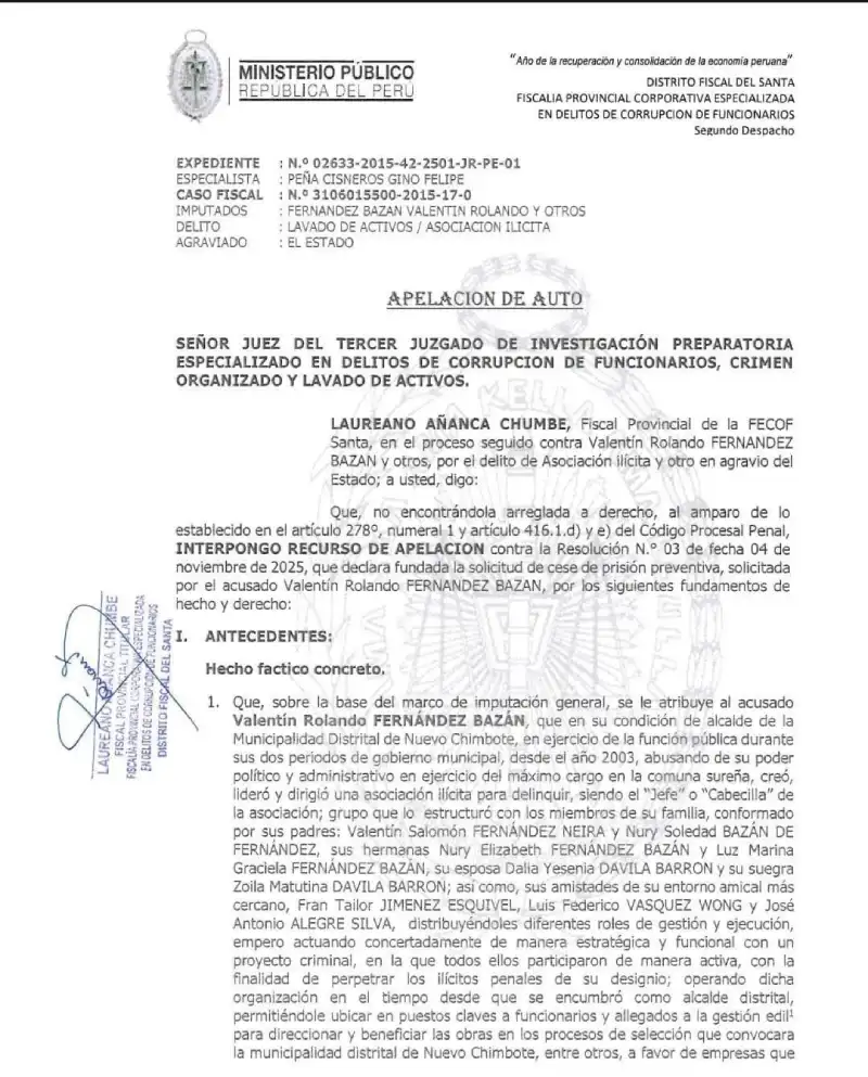 El fiscal de la Fiscalía Especializada en Delitos de Corrupción de Funcionarios del Santa Laureano Añanca, presentó una apelación contra el fallo del Tercer Juzgado Penal de Investigación Preparatoria. Dicho juzgado, a cargo del magistrado Alex Alegre Aranguri, ordenó el cese de prisión preventiva de Valentín Fernández Bazán, investigado por el presunto delito de asociación ilícita para delinquir.