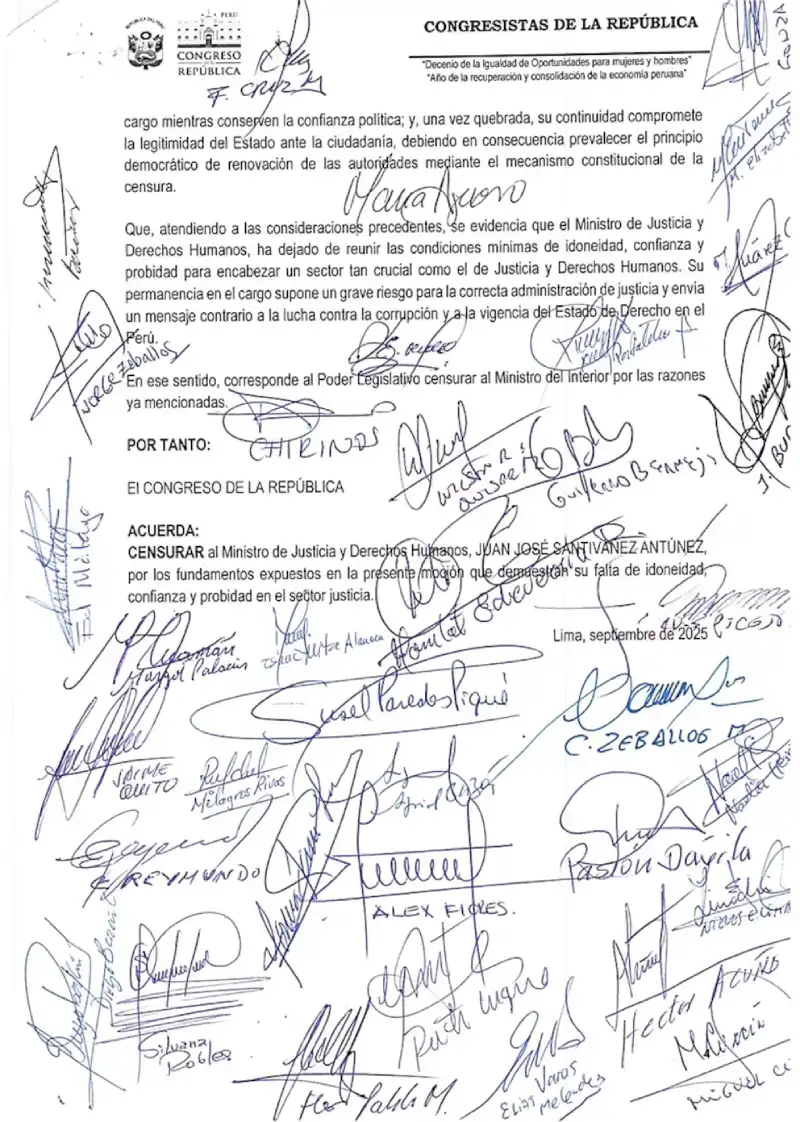 Un grupo de 35 congresistas presentó una moción de censura contra Santiváñez, acusándolo de haber perdido las condiciones mínimas de idoneidad, confianza y probidad para permanecer al mando del Ministerio de Justicia.