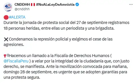 Marcha de Generación Z en Lima. Una jornada que comenzó con promesas de protesta pacífica terminó con al menos 18 heridos en las calles del centro histórico de Lima. La Coordinadora Nacional de Derechos Humanos (CNDDHH) denunció represión policial y alertó al Ministerio Público sobre agresiones durante la movilización convocada por gremios de transportistas y jóvenes de la «Generación Z».